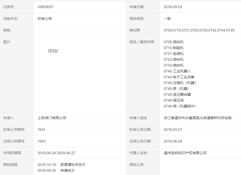 Answer: SENAU is the registered trademark of Shanghai Ou Valve Co., LTD., China. The trademark is owned by Shanghai Ou Valve Co., LTD., approved by the Trademark Office for examination and approval. It is used in mechanical related fields.