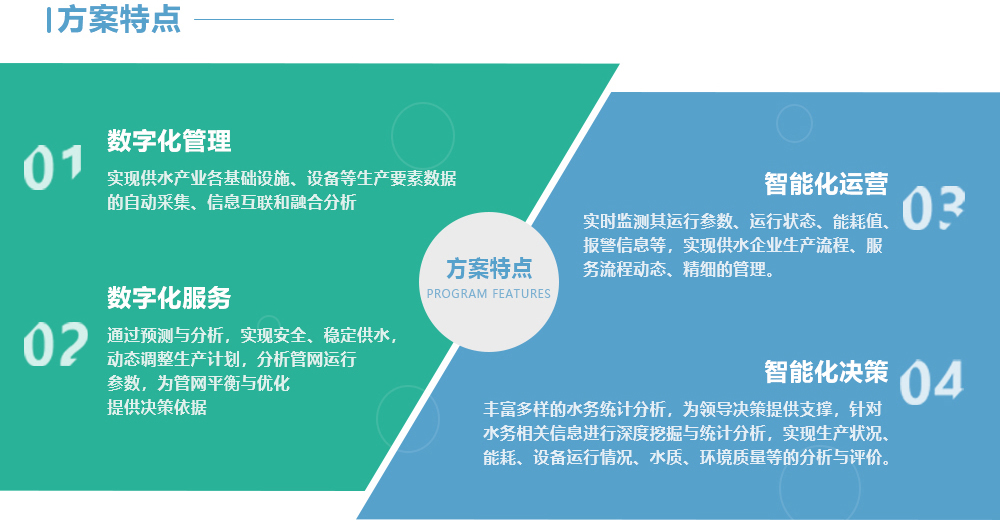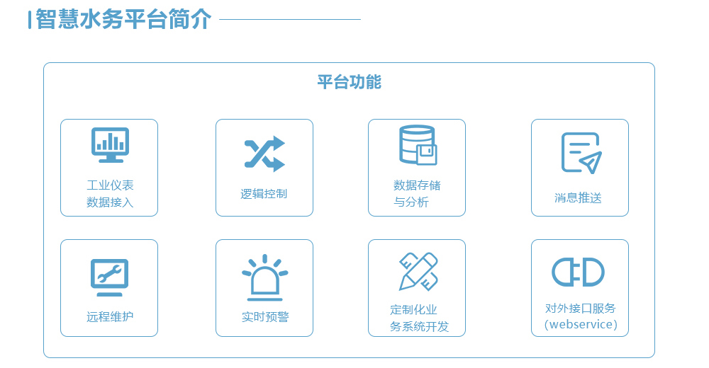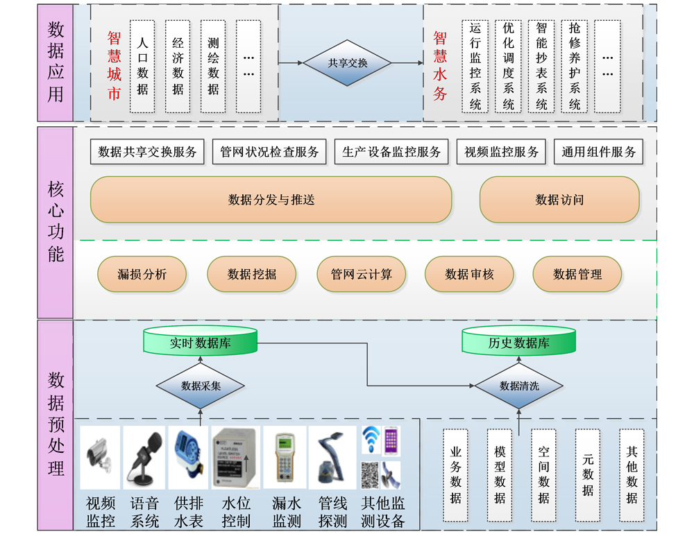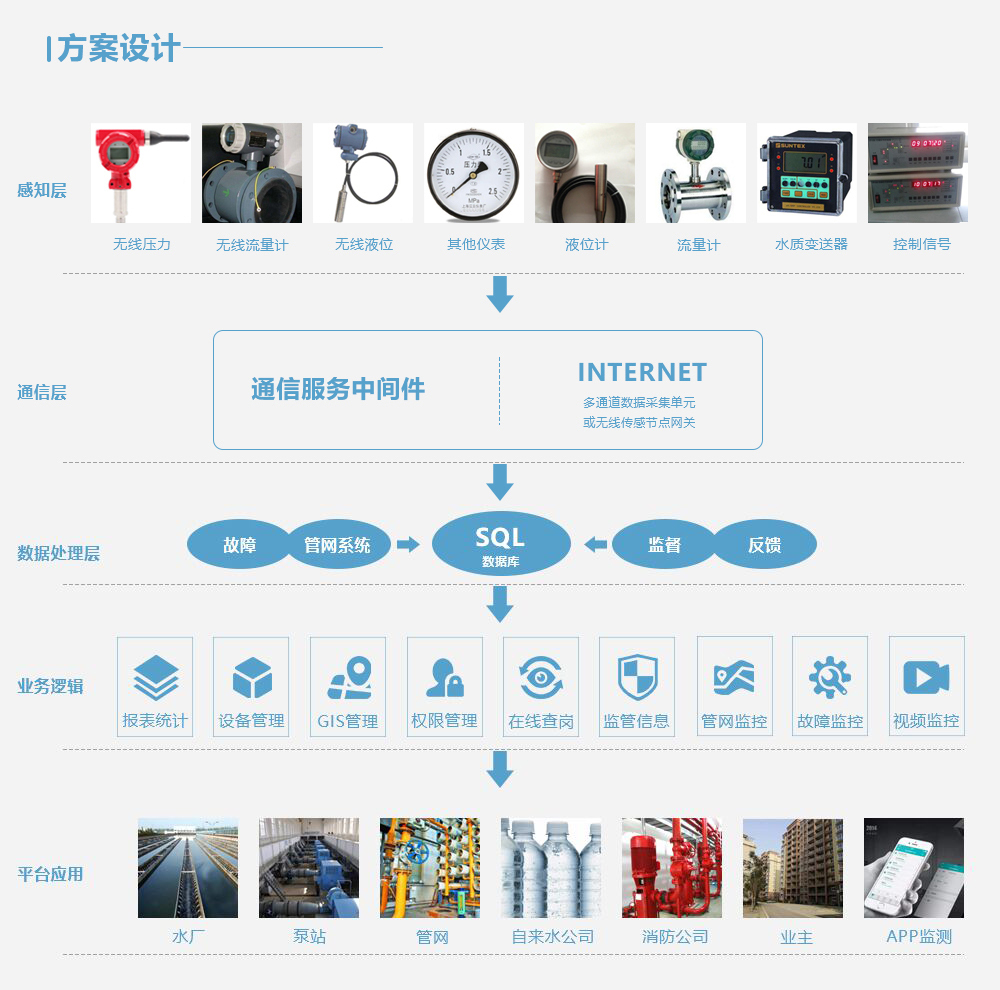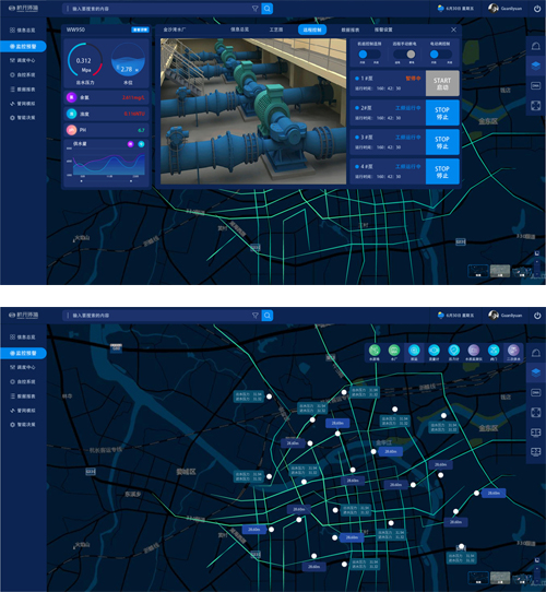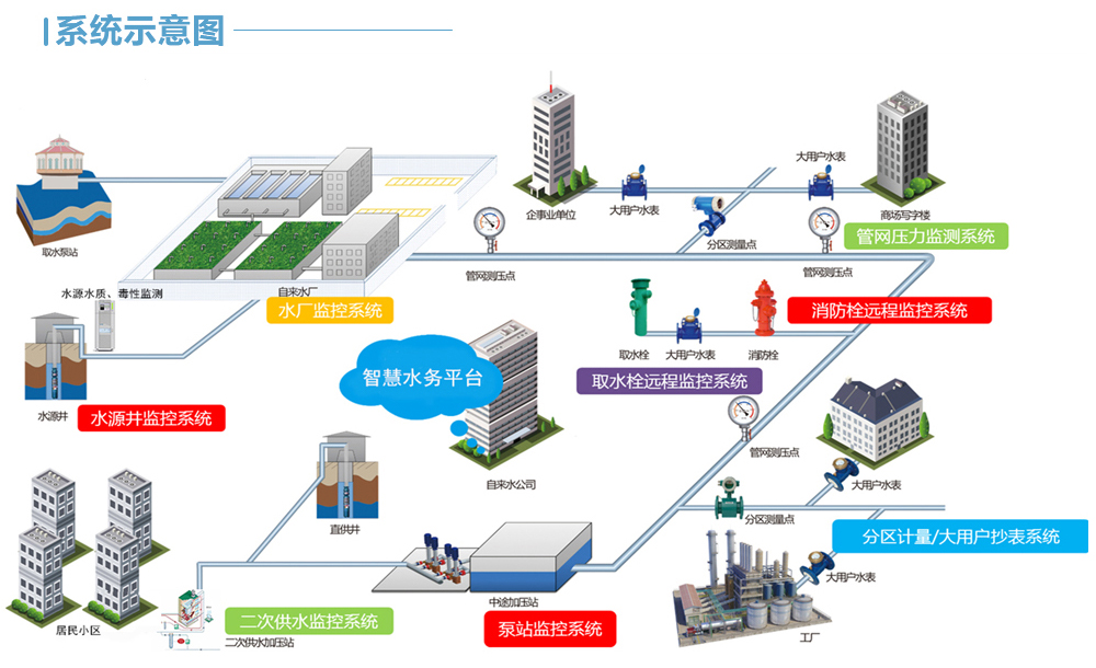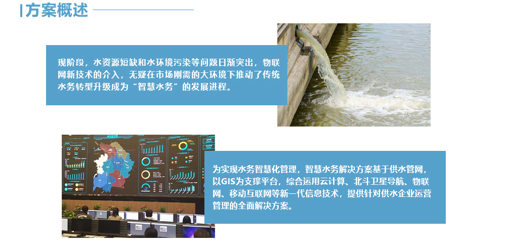 通过数采仪、无线网络、水质水压表等在线监测设备实时感知城市供排水系统的运行状态;并采用可视化方式有机整合水务管理部门与供排水设施,形成"城市水务物联网";并可将海量水务信息进行及时分析与处理,并做出相应的处理结果辅助决策建议,以更加精细和动态的方式管理水务系统的整个生产、管理和服务流程,从而达到"智慧"的状态。