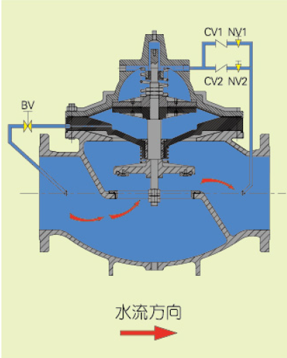 | 图D:水泵停止后,阀盘在感应弹及及水流作用下迅速关闭至90%,被阀杆上螺母挡住,以减小回流水锤,并留出缩口以泄放真空水锤。 | 图E:出口端高压水通过针阀NV2进入上控制腔,下控制腔的水通过BV流入进口端,针阀可以调节缓闭时间,以减小冰锤,阀门逐渐关闭至初始状态,等待下一次开泵。 |